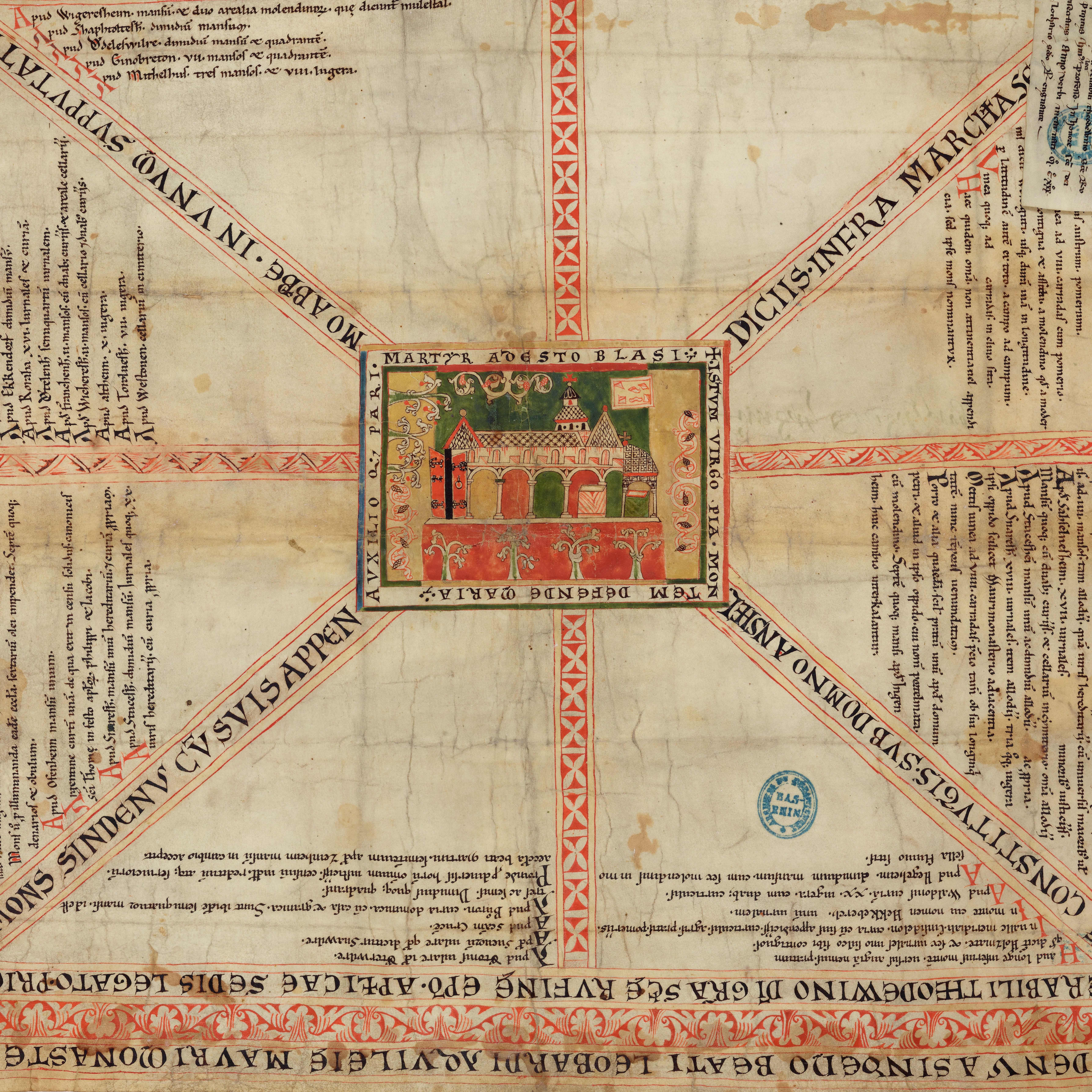 Charte plan de l’abbaye de Sindelsberg : l’abbaye est représentée au centre, son histoire est relatée dans les bordures qui délimitent des surfaces triangulaires où sont énumérées ses propriétés, [1123-1137] – AD67, G 1373/1.