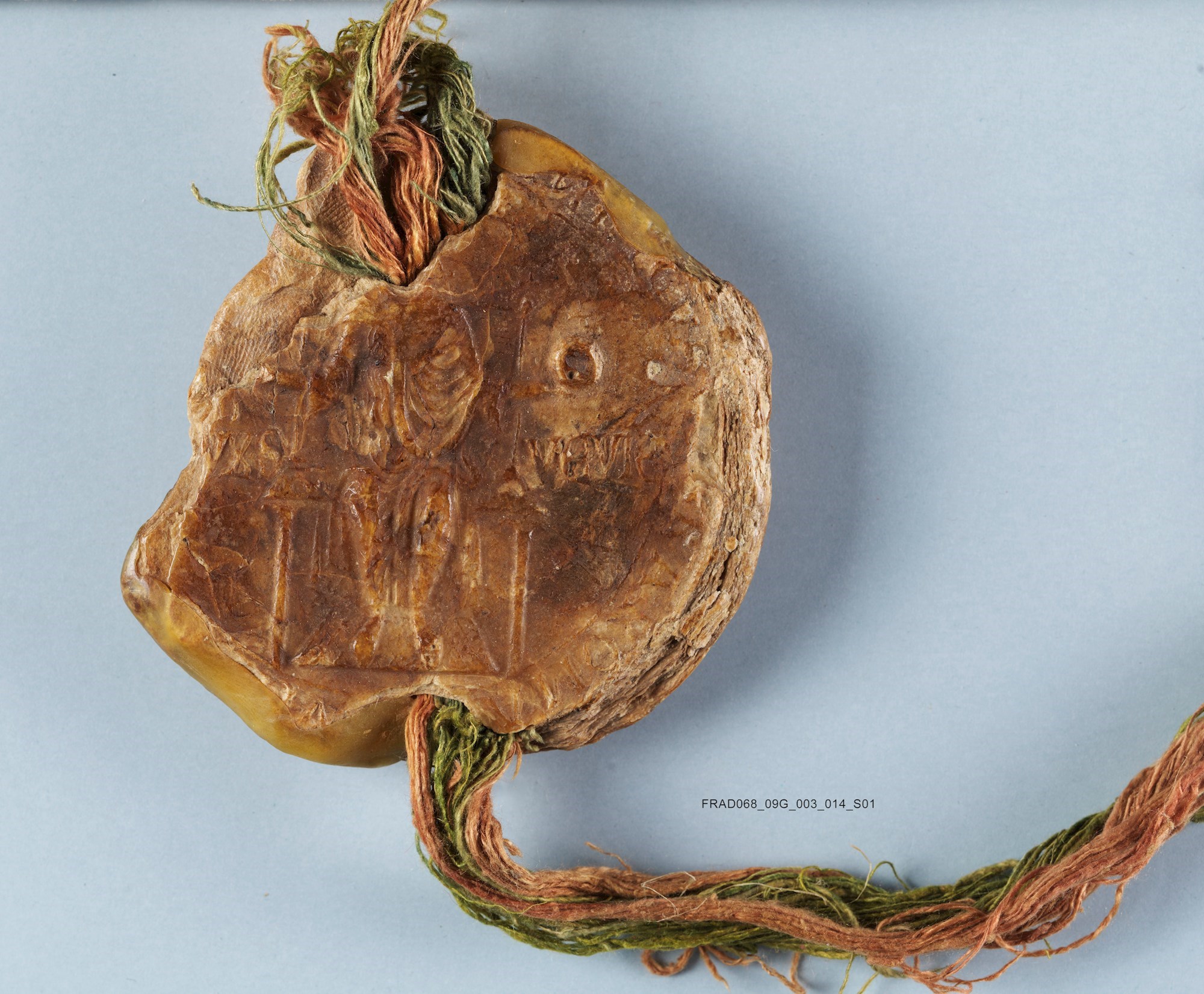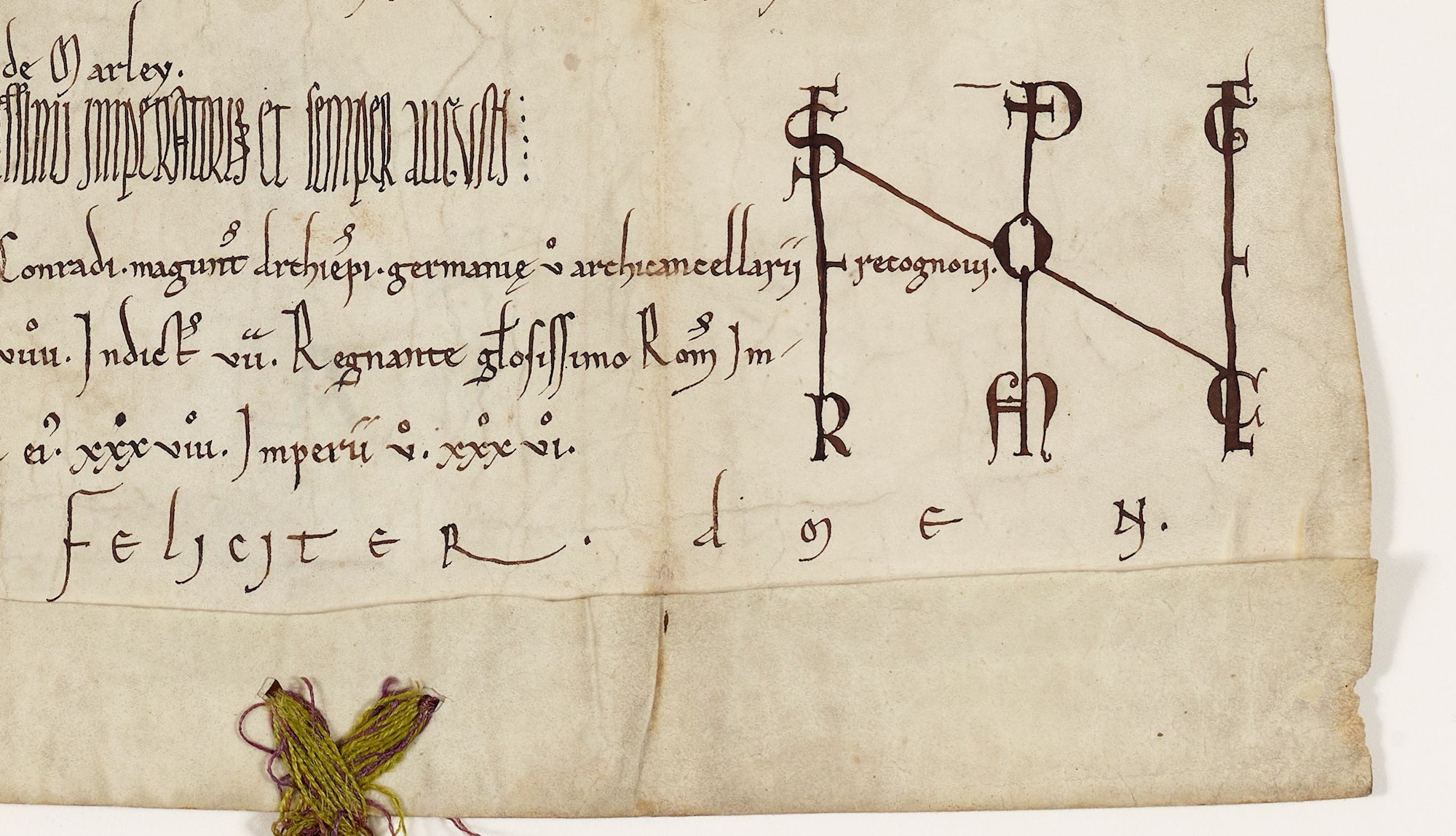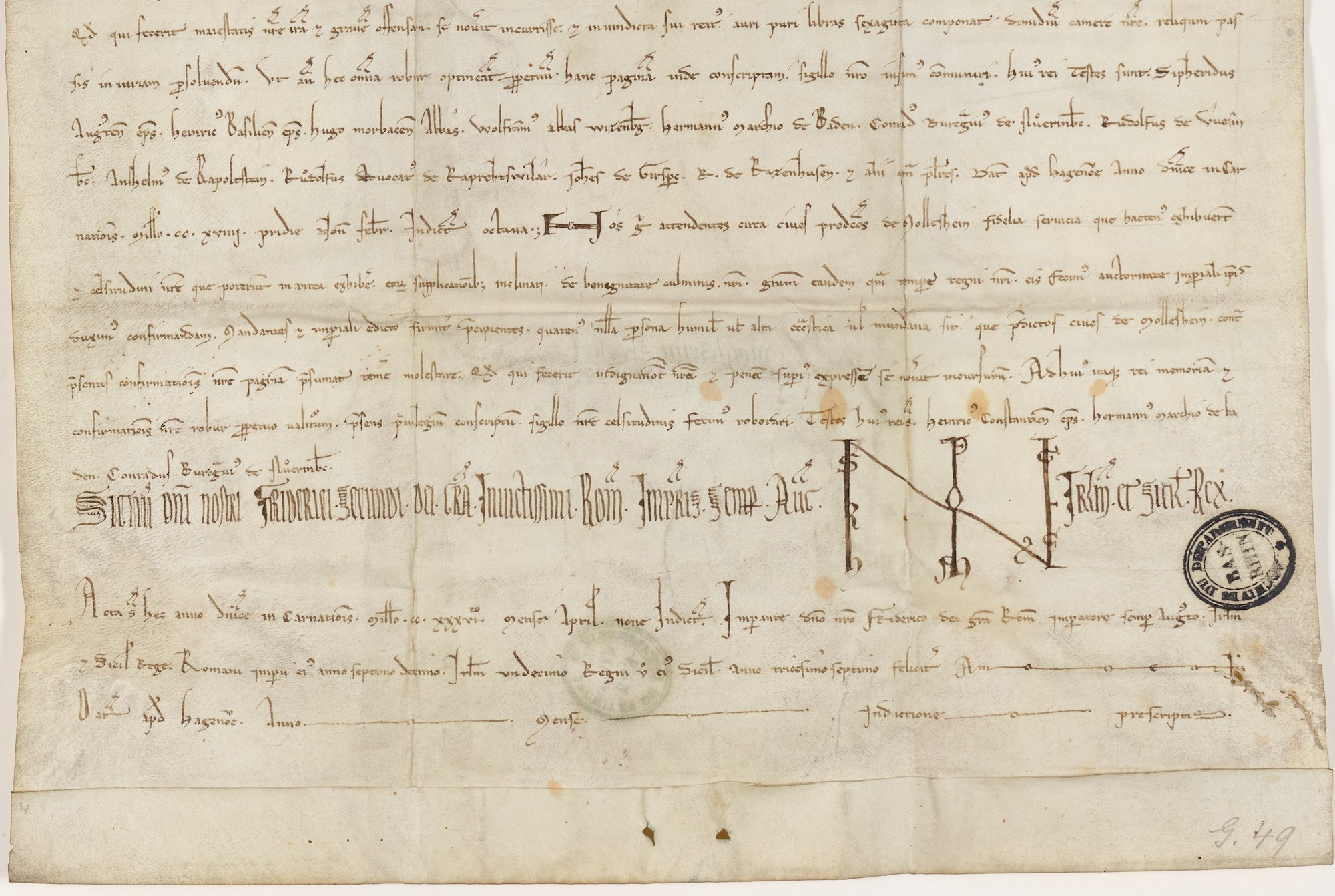 L'abbé de Murbach Hugues cède en fief au roi des Romains Henri VII ses possessions de Delle, ainsi que la moitié des revenus qu'elles génèrent, à condition que le roi y fasse construire une forteresse, 1232 – AD68, 9G/TITRESGENERAUX/3/14. Reproduction : Isabelle Gérard (c) Collectivité européenne d'Alsace.
