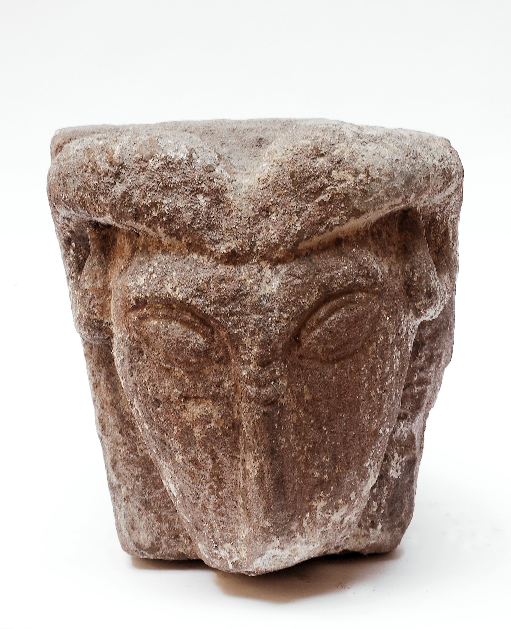 Corbeau à tête de bovin. Elément d'architecture destiné à soutenir la naissance d'une voûte, trouvé en 1955 lors de fouilles archéologiques menées rue de l'Ail à Strasbourg. Sculpture décorée d'un masque de bélier. Grès rose. 3è quart du XIIe siècle (vers 1160-1180). Prêt du Musée de l'Œuvre Notre-Dame de Strasbourg. N° inventaire 22.978.0.1.1. Photographie : Mathieu Bertola - Musées de Strasbourg.