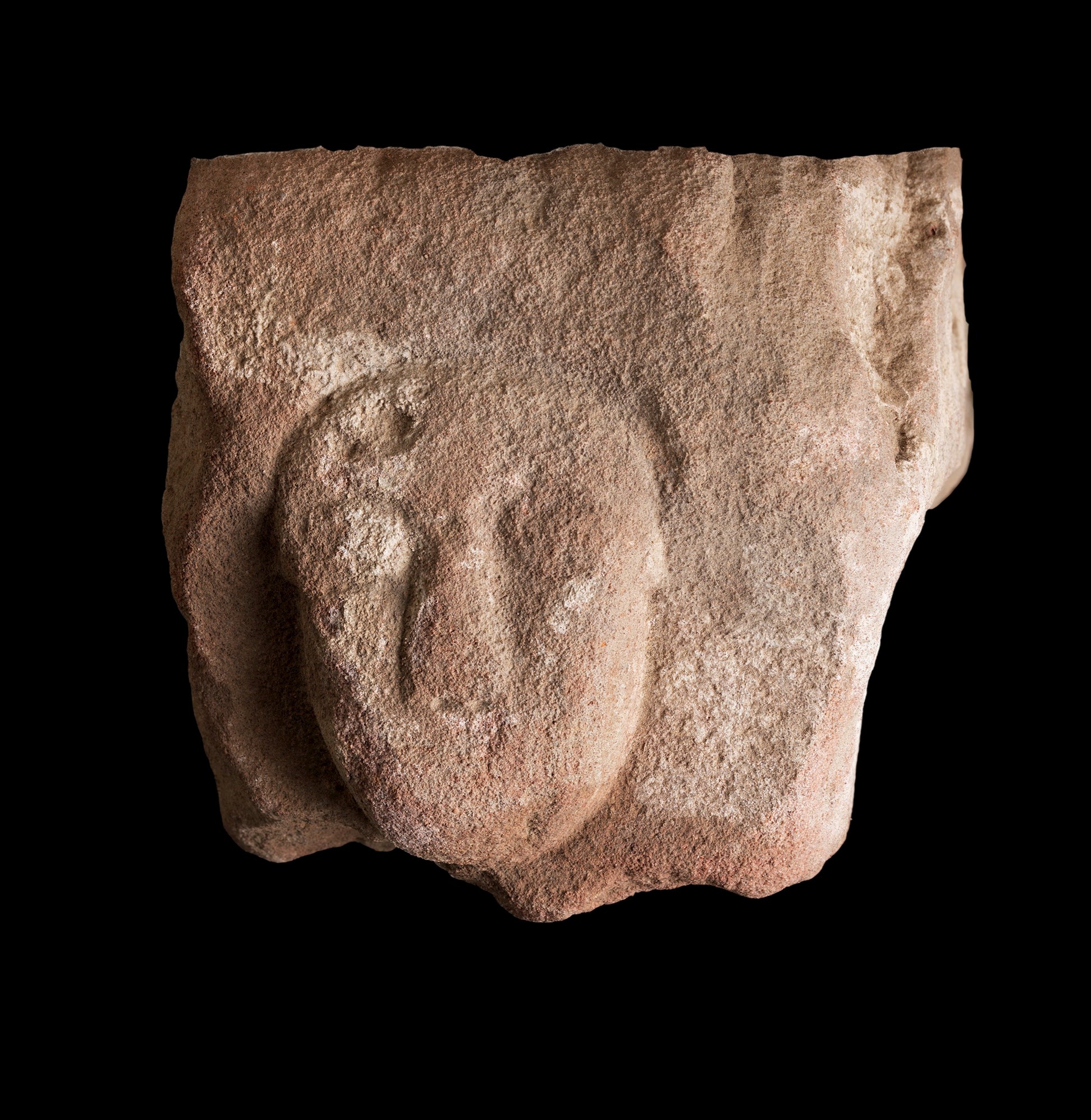 Élément lapidaire à masque, de type « Neidkopf ». Fragment de grès sculpté. Vestige archéologique mis à jour lors des fouilles du château du Haut-Koenigsbourg, en 1900. Epoque romane (XIIe – XIIIe siècles). Prêt du château du Haut Koenisbourg. Reproduction : Isabelle Gérard (c) Collectivité européenne d'Alsace.