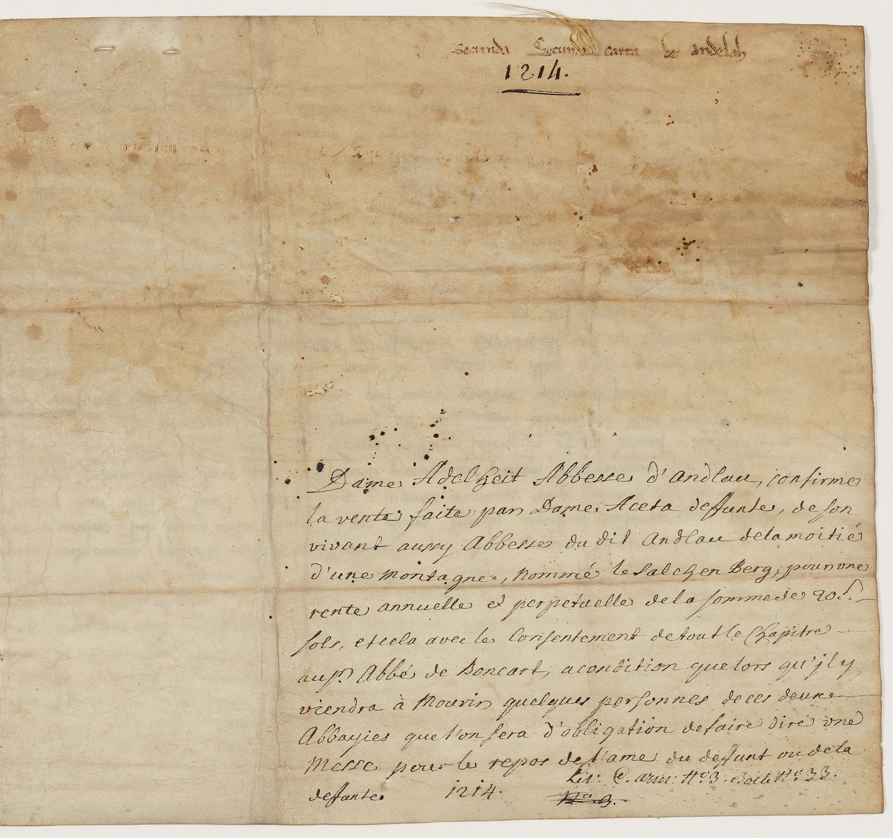 Adélaïde, abbesse d'Andlau, confirme la cession faite par l'abbesse Haizka de la moitié du mont Salchenberc à l'abbaye de Baumgarten, et donne l'autre moitié du mont aux moines, contre un cens annuel de 5 sols, 1214 – AD67, G 108/4 et H 2348/8.
